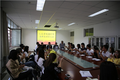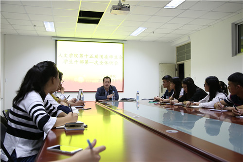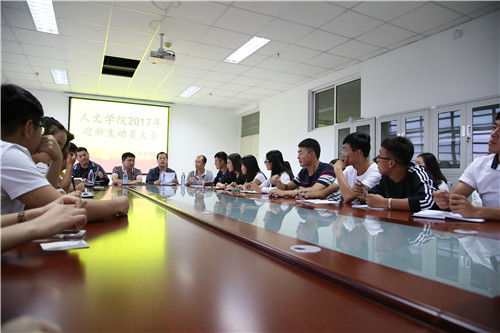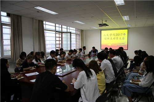 在贺兰山校区文荟楼中文系会议室召开了2017年迎新生动员会。学院党委副书记马小军、学办主任刘杰、2017级辅导员潘巍及2017级兼职辅导员孙辉出席了此次会议,由刘杰担任主持,第十五届团委学生会全体学生干部参加。