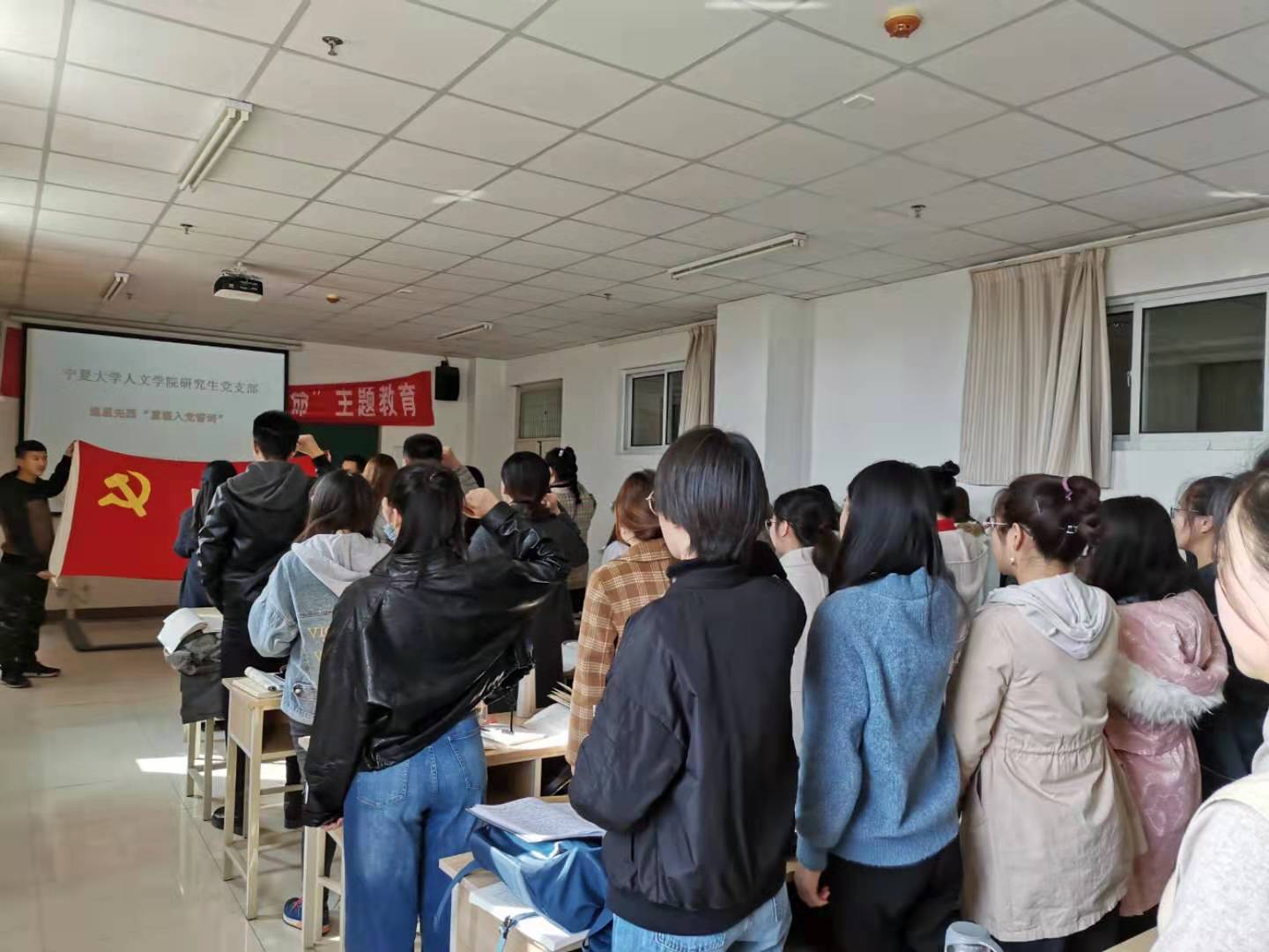 研究生党支部全体党员在文科楼717教室举行重温入党誓词宣誓和观看爱国电影活动。
