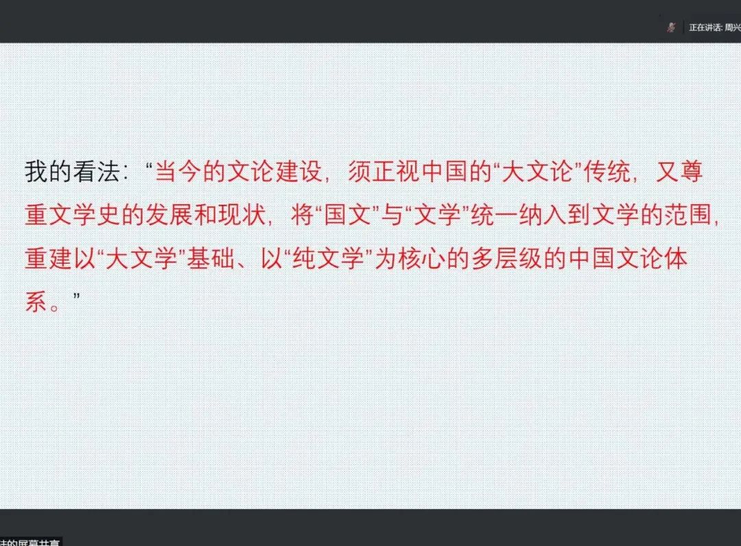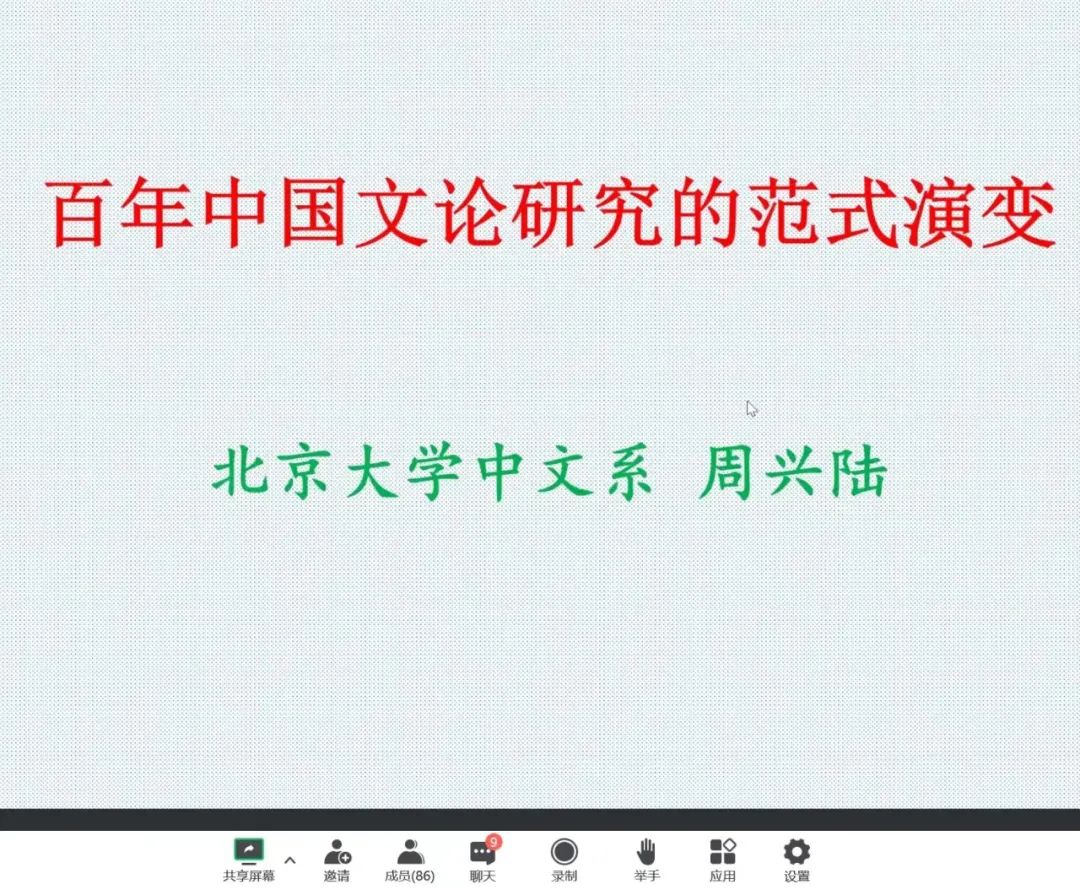 举办了题为“百年中国文论研究的范式演变”的学术讲座,讲座采用线上的形式展开。本次讲座特邀北京大学中文系教授,博士生导师周兴陆老师主讲,捕鱼大作战
