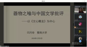 闫月珍教授简单介绍了中国文学批评中存在的“以自然物喻文”“以人喻文”“以器物为喻”的三大方式,之后以《文心雕龙》为中心,重点阐述“器物之喻与中国文学批评”,讨论了中国文学批评中的“工匠”、器物制作与法度和典范观念、器物之喻的天文和人文意义以及器物之喻作为普遍的文学经验四个内容。
