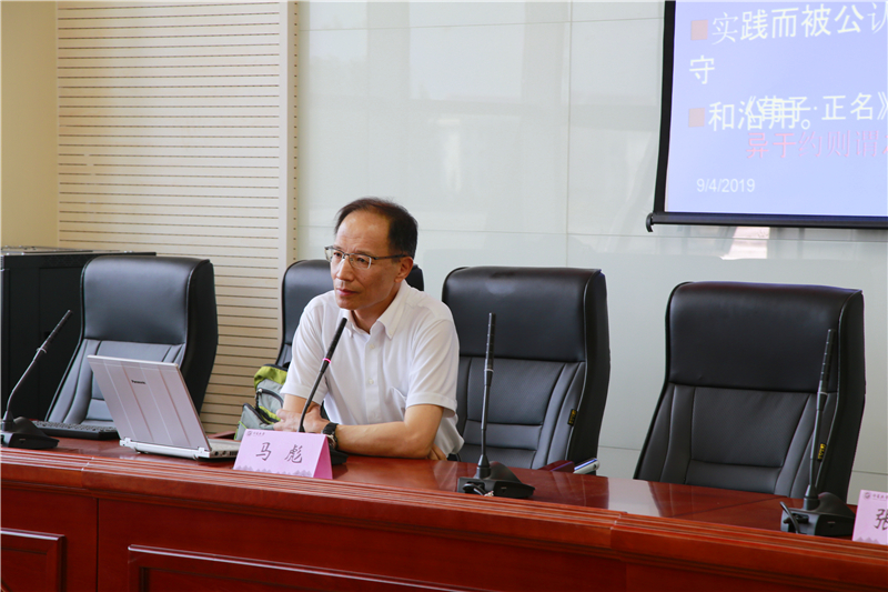 对马彪教授的到来表示热烈欢迎。在开讲之前,马彪就《孟子·离娄》中,“离娄之明,公输子之巧,不以规矩,不能成方圆”,这句话提出了“究竟是先有规矩,还是先有方圆”的问题,引起了大家思考。接着,马彪讲到,“规矩”在中国有很深厚的历史,仅以“伏羲女娲之规矩”为例,在今天考古发掘的文物中有众多相关的壁画图文。随后他就为什么要制定“标准”和中国历史上的“标准”问题展开讲解,并以中国最早的高速公路——“秦朝弛道”为例详细指出制定“标准”的重要性。结合中国古代周代就实行的“同姓不婚”的严格姓氏标准及其制度,他解释了“标准化问题”。并结合同学们提出的问题强调了“标准化”不是“僵化”,要注意在这过程的转换中有一个度的变化。接着,他还指出,“规矩”、“标准”随时随处存在于人类活动现象,有意识地制定、因循“规矩”、“标准”很重要,有序、和谐才是“标准化”的目的。讲座最后,张新军作总结发言,他指出马彪教授的讲座以诙谐幽默的语言向大家清楚地解释了中国古代关于“规矩”、“标准化”的问题,使我们看到了中国古人的智慧,给人以深刻的启发。