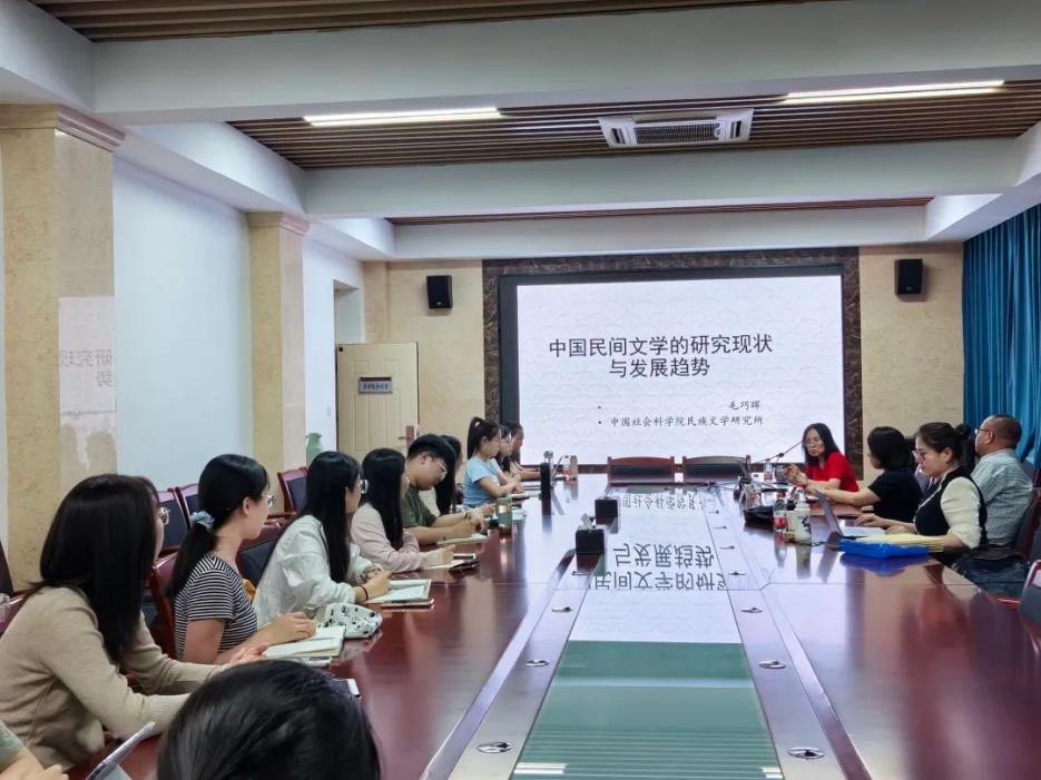 于怀远校区怀远楼718室举办了题为“中国民间文学研究现状与发展趋势”的学术讲座。本次讲座特邀中国社会科学院民族文学研究所研究员、北方室主任、中国社会科学院大学教授、博士生导师毛巧晖老师主讲。讲座由捕鱼大作战