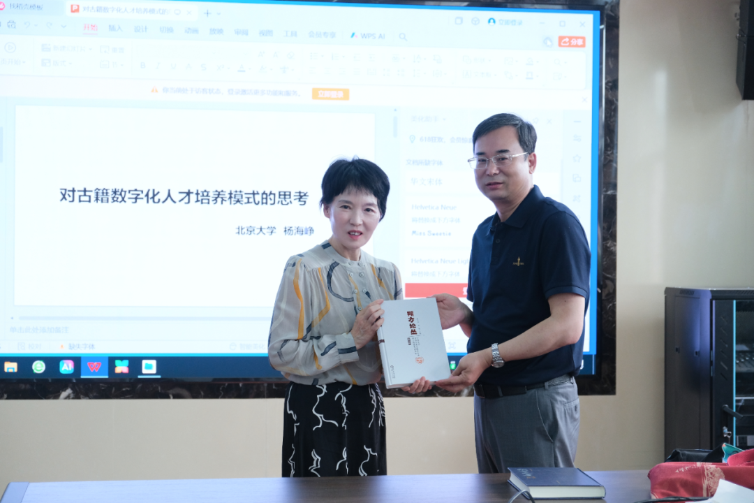 讲座伊始,邵敏副教授系统介绍了杨海峥教授的学术成就,并代表学院对杨教授的到来致以诚挚欢迎。随后,胡玉冰院长向杨海铮教授赠送了国家社科基金重大项目“《朔方文库》编纂”学术成果《朔方文库提要图录》和《朔方论丛》等。