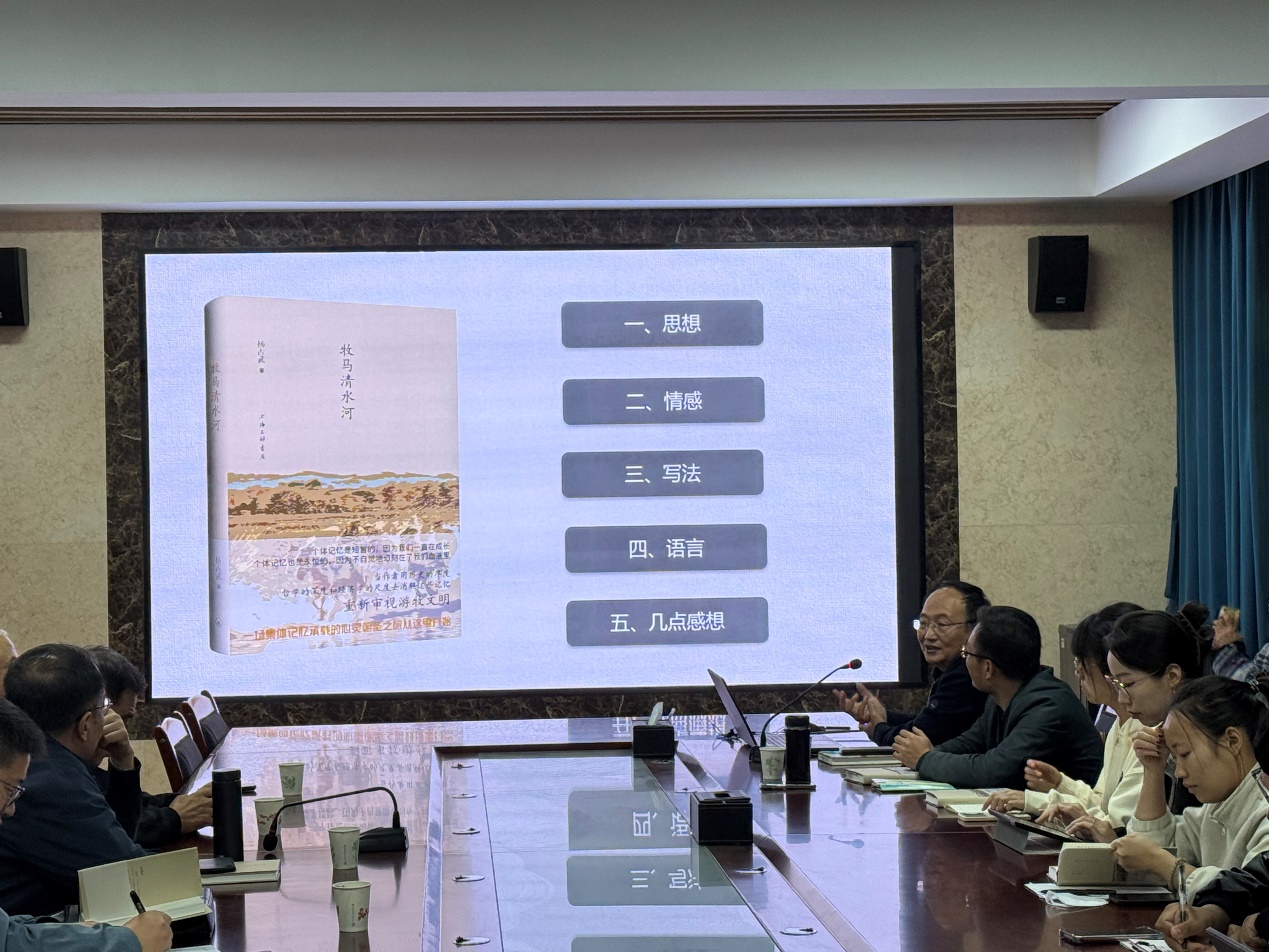 在怀远楼718室举办《牧马清水河》作品研讨会。特邀作者杨占武研究员作了题为“漫谈:关于我的散文写作”的讲座,作家季栋梁、金瓯、田鑫,《黄河文学》副主编计虹,宁夏大学教师王岩森、丁峰山、张富宝、王琳琳等出席本次研讨会,中国现当代文学、文艺学、学科语文方向硕士研究生及部分本科生参加此次活动。