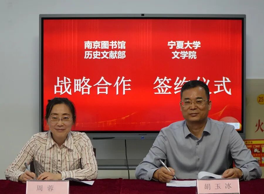 院长胡玉冰教授与南京图书馆历史文献部副主任周蓉分别代表甲方、乙方签字。