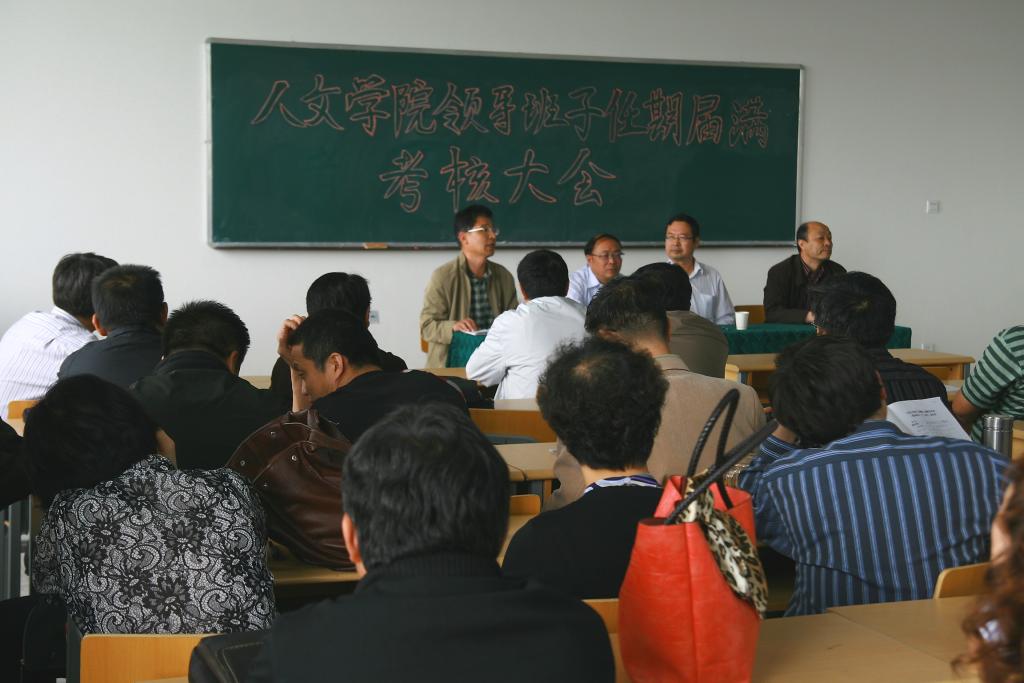 领导班子任期届满考核暨教职工大会在A区文科楼406教室召开。校领导李伟副校长,校第二考核组组长、校纪检委杜国华副书记及其成员,人捕鱼大作战