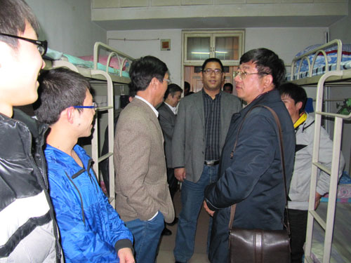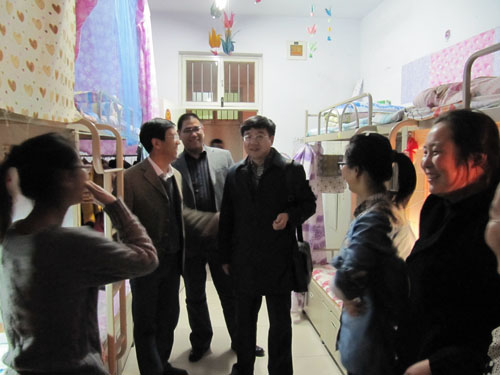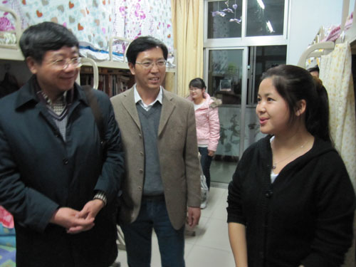 3月14日晚,学院党总支书记梁向明、院长郎伟、副书记陈柯、金玉河、副院长张天政一行深入到学生宿舍中查看和了解学生近期生活及学习情况。几位院领导来到学生宿舍耐心细致地和同学们进行了交流,询问她们的生活状况及需求,对学生们普遍反映的各种问题给予相应的解答与指导,关心他们在校的学习和生活情况。同时,对学生公寓的安全隐患、不良现象及卫生情况提出了要求,还特别向2011级的学生们强调了宿舍的安全用电、防火、防盗等问题,并嘱咐出现问题及时上报学院值班老师,以免造成安全隐患伤害个人和家庭。一句句简单的话语、一声声嘘寒问暖的问候传递着学院领导对学生细致入微的真切关怀,让同学们倍感温暖。通过这样的方式学院老师与同学们进行了亲密的交流和沟通,也拉近了师生之间的距离。能让学生的许多实际情况得到很快的解决,更全身心的投入到学习中去。