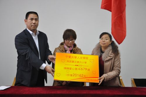 党总支副书记金玉河、学生工作办公室主任刘杰、西夏区团委书记王一虹、西夏区第六小学校长石丽娟、副校长马斌等领导参加了此次活动。此次捐书活动共向西夏区第六小学捐赠图书679本,价值20162元,书籍内容涉及科学、历史、文学等多个领域。