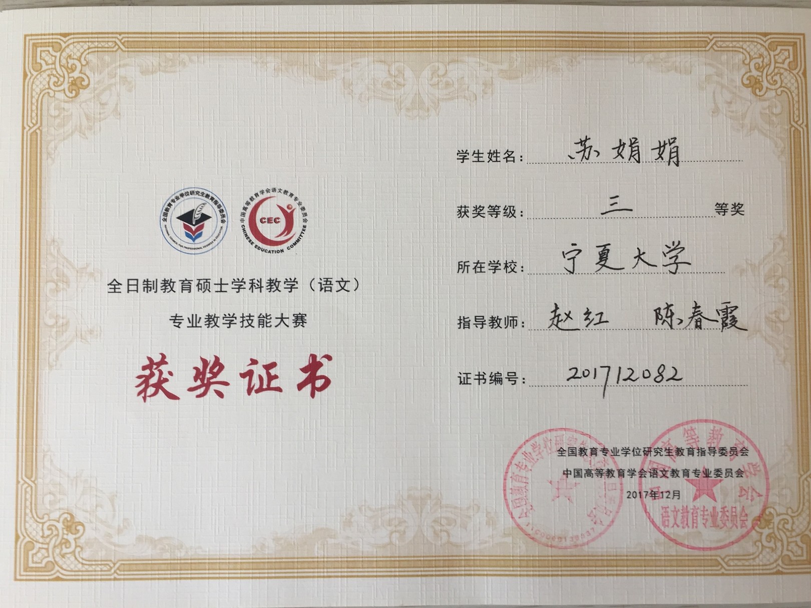 学科教学(语文)硕士点注重培养学生的教学实践能力,指导研究生参加各类教学技能大赛。2017年11月,2017级学科教学(语文)专业的姚心瑞、杨景瑶、安灵童在宁夏高校教育硕士教学技能大赛中分别获得了二等奖两项,三等奖一项的优异成绩。大赛提升了教育硕士的教学实践能力,也为高校教师交流教学经验、展示学子教学风采提供了平台。