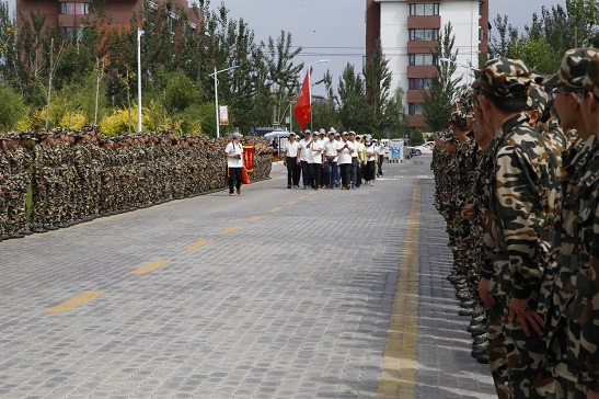 军训团时,听得见“同学们好!”,“老师好!”,“同学们辛苦了!”,“不辛苦!”看得见的却只有是他们纹丝不动的身影。老师们亲切地问候、同学们也热情地回答,掌声夹杂着笑声此起彼伏,响彻整个校园。人文女兵声音清脆响亮,男兵声音雄浑有力,一声声“钟灵宁大,毓秀人文”,将人文学子昂扬的军魂、挺拔的意志,飒爽英姿淋漓尽致地展现出来。那长长的健步走队伍像一条彩带穿梭在校园,和新生军绿色的迷彩服交相辉映,构成了宁夏大学一道独一无二的壮丽风景线。在历经近半个小时的慰问之后,人文军训团以嘹亮的迎接口号、饱满的热情迎接了最后一波老师,稍作休整之后又投入到正常的军训作业。