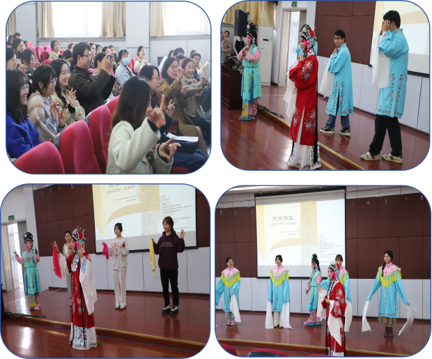 第二部分是专业戏曲表演。黄娟老师首先表演了眉户戏,《屠夫状元》中的精彩片段,一招一式,尽显舞台艺术的风采。表演环节之后,黄老师现场解答了同学们对眉户戏的疑惑,介绍到眉户戏不同于秦腔的高昂激扬,粗犷豪放,唱腔较为委婉细腻,优美动听,富于悲痛,表演动作较为真实、生活化,整体风格较为现代的特点。还通过脸谱的现场展示讲解了戏剧脸谱不同颜色代表不同的人物等问题。第二位登台演出的是张蕾老师,她表演了秦腔折子戏《五典坡》中的“飘彩”片段。表演部分结束后应学生采访进而向观众介绍了秦腔的服饰特点、种类等;为了细致体现头饰的介绍,张老师特意带来了珍贵的头饰箱,逐件进行了讲解。两位老师凭借着娴熟的演技、灵活的身手、动听的唱腔旋律、连贯的动作表演和细心精准解答疑惑的态度,赢得场下观众的阵阵喝彩。