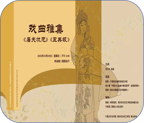 高雅艺术进校园,文化盛宴润心田。为进一步传承中华民族优秀传统文化,激发学生阅读经典的兴趣,营造良好的学术交流氛围,提升学生的审美情趣和艺术素养,10月29日下午2点半,2023年宁夏大学研究生学术论坛项目“中国文学经典读书会”第6期《屠夫状元》《五典坡》戏曲专题雅集在怀远楼二楼报告厅举行。