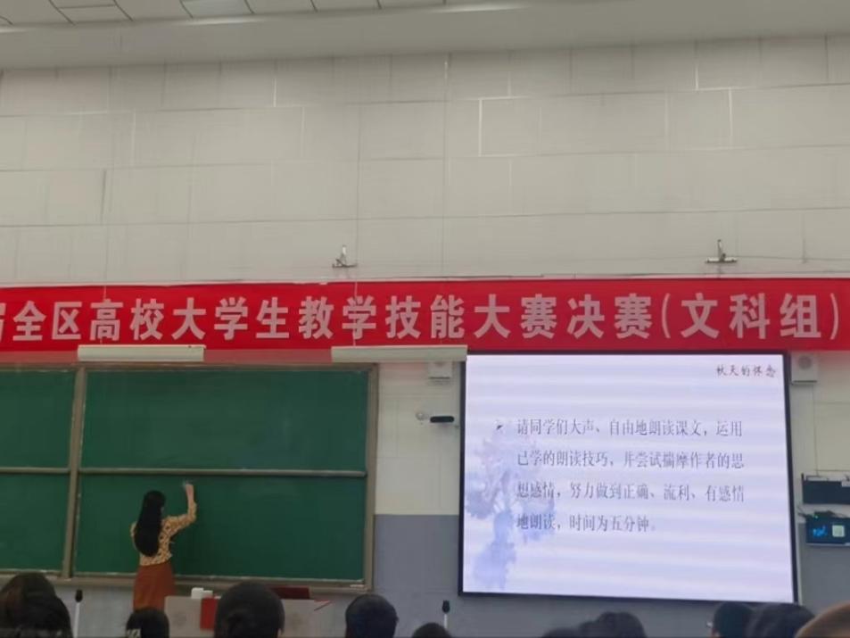 师范生在全区教学竞赛中连创佳绩。2021年邹千千同学获得第五届全区高校大学生教学技能大赛(文科组)一等奖。2022年陈钰露、张婉睿两位同学获得第六届全区高校大学生教学技能大赛(文科组)一等奖,今年孙曦晨同学在此次比赛中再次夺冠。