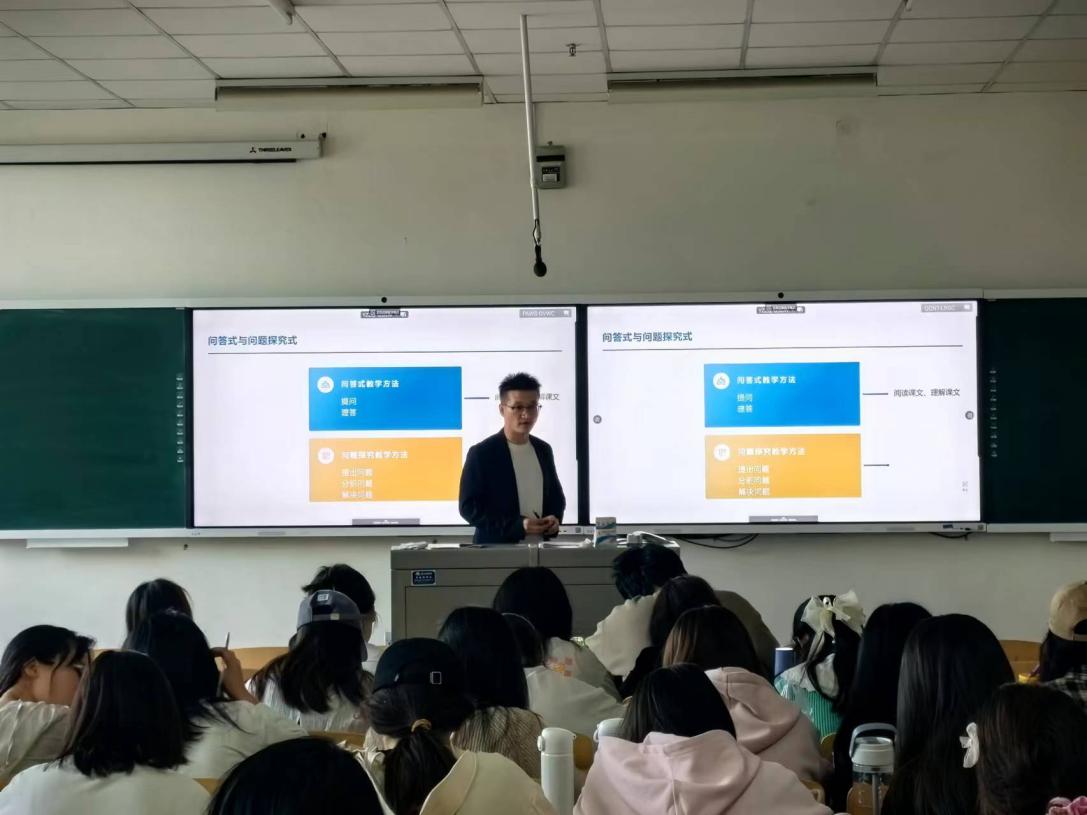 杨明托老师以饱满的热情和深厚的专业功底,向同学们展示了如何通过巧妙的问答设计,激发学生对文学作品的深度探索。此次示范课,杨老师灵活运用递问、逆问、假设问等策略,步步推进,引导学生深入思考,激发课堂活力,展现出问答式教学的深度与广度。学生们在互动中不仅学习了提问技巧,更锻炼了批判性思维和人文素养。